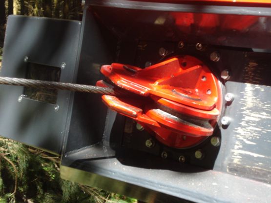 Die Ausrüstung mit der Herzog Spezialseilwinde, welche mit dem Radantrieb des Forwarders synchron arbeitet, bildet das Hauptelement um aus dem normalen Forwarder einen Steilhangspezialisten zu machen. Die Winde leistet mehr als 50% der erforderlichen Vortriebskraft bei der Bergfahrt und bremst die Maschine kontinuierlich bei der Bergabfahrt. Die Winde macht es möglich nahezu ohne Schlupf an den Rädern und dadurch ohne Verletzungen am Waldboden zu verursachen, das Holz kostengünstig und umweltfreundlich aus Steillagen von über 50% Hangneigung zu transportieren. Ist das Seil einmal an einem Baum fixiert, kann der Fahrer sowohl bergauf wie bergab das ganze Holz einer Gasse rücken und das auch wenn sich das Wetter einmal nicht von der besten Seite zeigt und zwar ohne Bodenschäden ! |